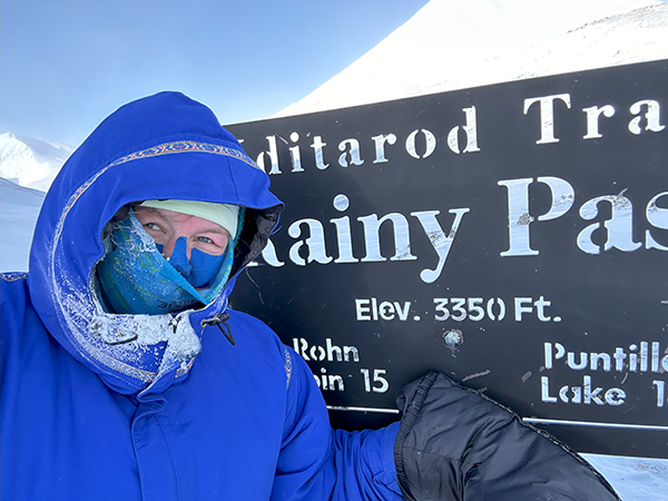 8. Reaching her final destination in Nome in western Alaska, Leah rejoices after spending the last few days in a wet winter storm.