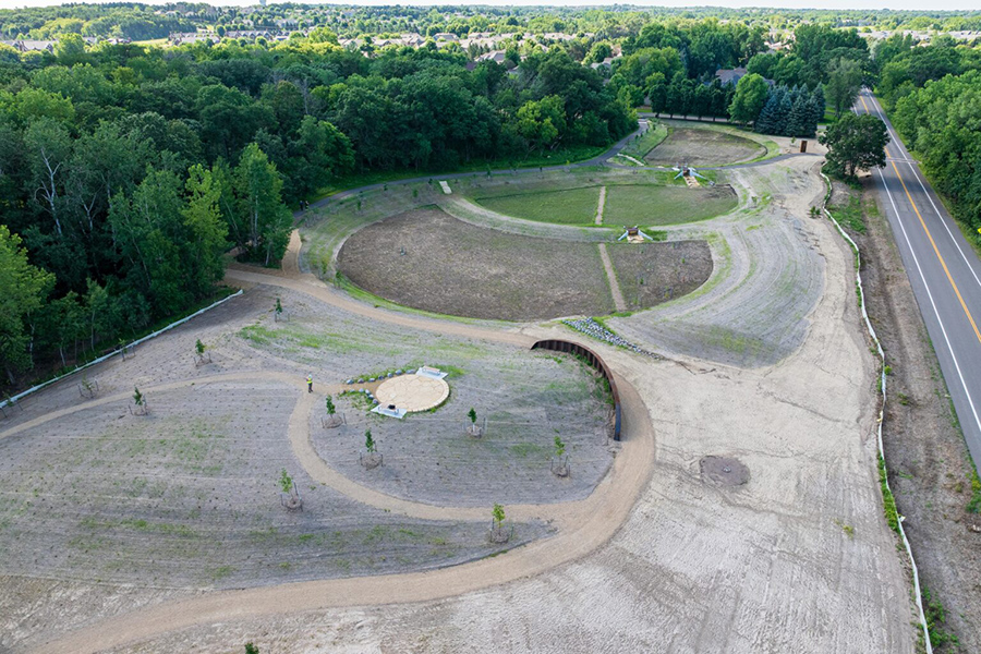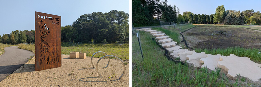 When runoff from a suburban wetland complex threatened to impact the high water quality of a nearby lake and an undeveloped area between the two bodies of water, a team of engineers, landscape architects, the city, and the watershed district worked together to create a solution. The result is a beautiful park that cleans the water using soil infiltration and native plants and educates visitors with public art that explains the importance of natural systems for stormwater treatment.