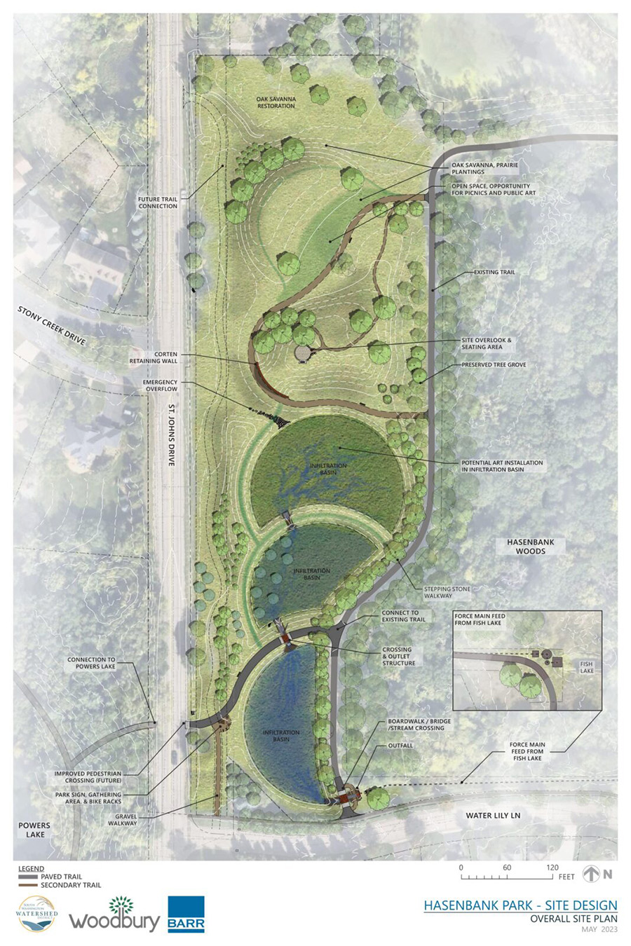 Fish Lake, a wetland complex, receives nutrient-rich runoff from nearby developments, which then flows into Powers Lake. Powers Lake has historically been quite clean and clear for an urban lake, but since its connection with Fish Lake, the addition of runoff high in phosphorus threatens water quality and increases the likelihood of nuisance algal blooms. In 2021, the South Washington Watershed District (SWWD) commissioned Barr Engineering Co. to conduct a feasibility study to determine best management practices that could preserve the high water quality in Powers Lake. Following a series of design phases, Hasenbank Park was constructed in 2023–2024, and habitat restoration will continue through 2026.