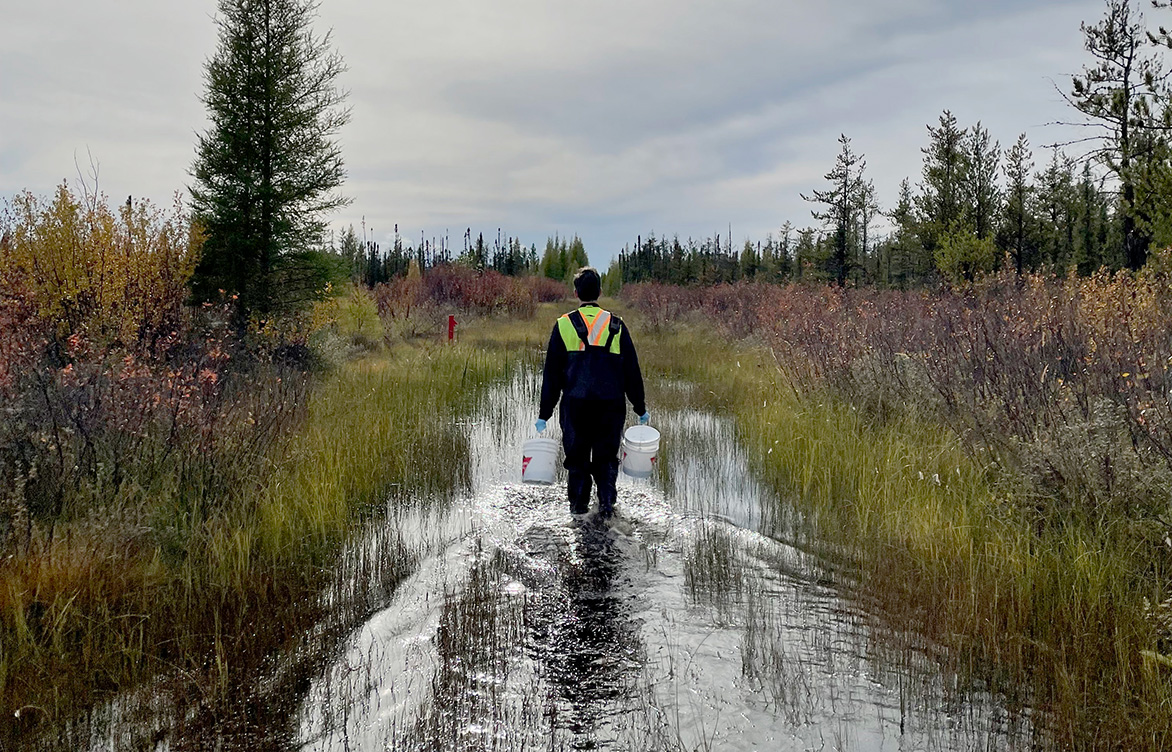 Most mine closure plans call for some form of land reclamation. At a mine-reclamation site in Canada’s Northwest Territories, a Barr employee walks through a wetland collecting water samples.