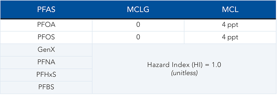 The U.S. Environmental Protection Agency (EPA) announced on March 14, 2023, the much-anticipated proposed National Primary Drinking Water Regulation (NPDWR) for six per- and polyfluoroalkyl substances (PFAS). The proposal, like NPDWR for other chemicals, includes non-enforceable Maximum Contaminant Level Goals (MCLGs) and enforceable Maximum Contaminant Levels (MCLs), as shown below.