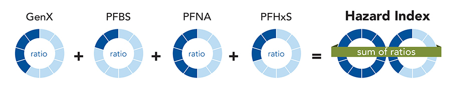 The proposal for the four additional PFAS compounds (GenX, PFBS, PFNA, and PFHxS) was something of a surprise, given that they are not included in the EPA’s PFAS Strategic Roadmap, which was first published in October 2021 and updated in November 2022. The EPA is proposing the MCL for these four PFAS to be set as a mixture using an additive approach known as Hazard Index (HI; see graphic below). The HI approach is commonly used for Superfund cleanups but has never been applied to MCLs. Some current MCLs consider the total summed concentrations of multiple contaminants (e.g., polychlorinated biphenyls or PCBs); however, none use the “sum of ratios” additive approach of an HI.
