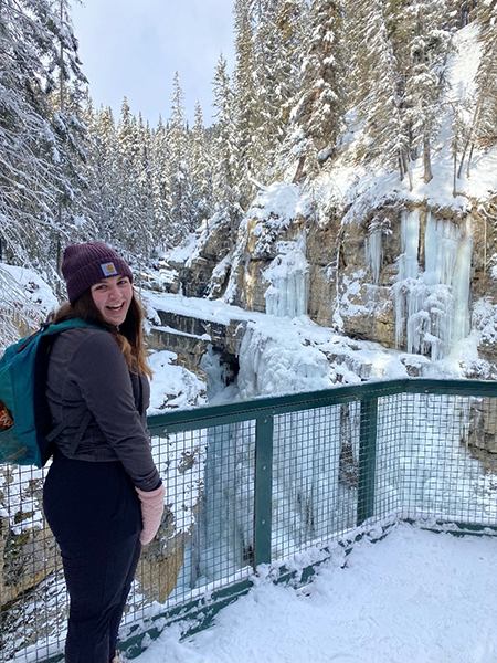 2. Jordan’s passion is spending time in the outdoors. Here, Jordan hikes in snow-covered Banff in Alberta, Canada.