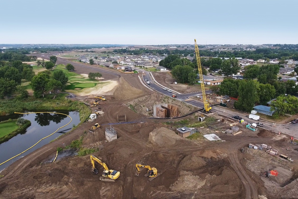 Drone footage shows construction of Souris River (Mouse River) flood-risk reduction structures.